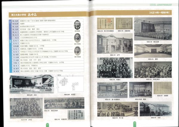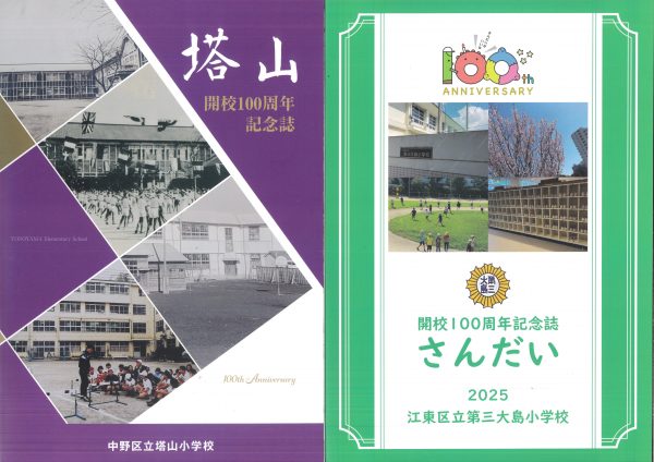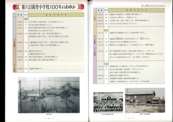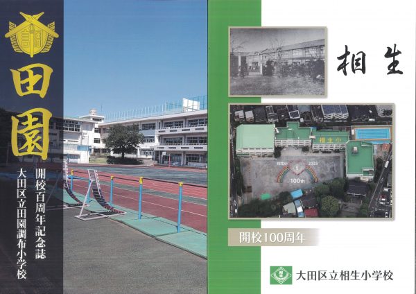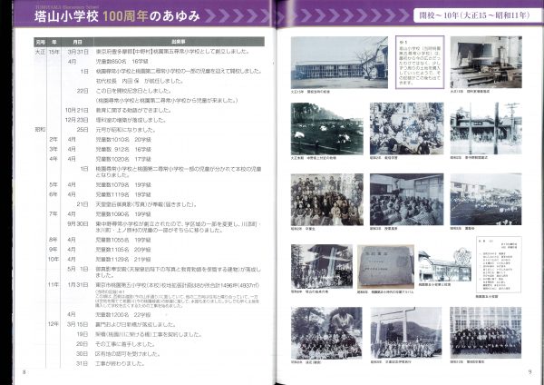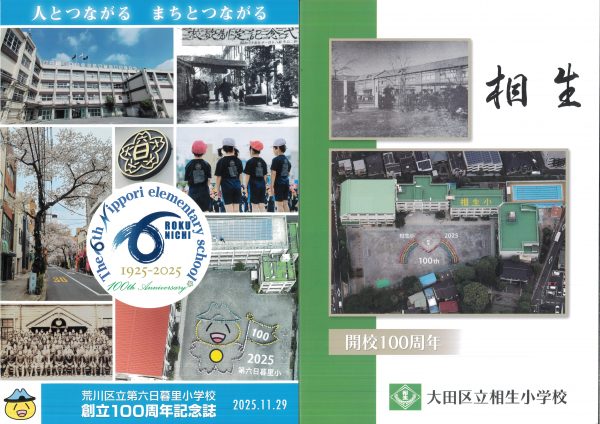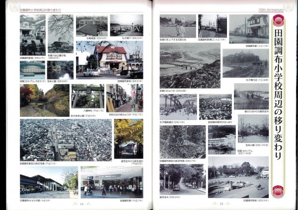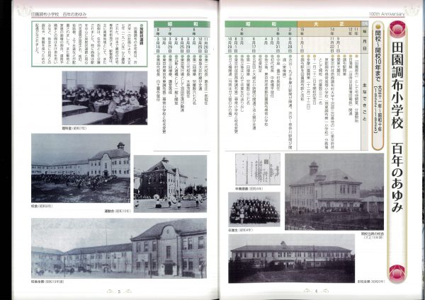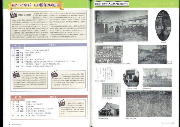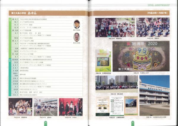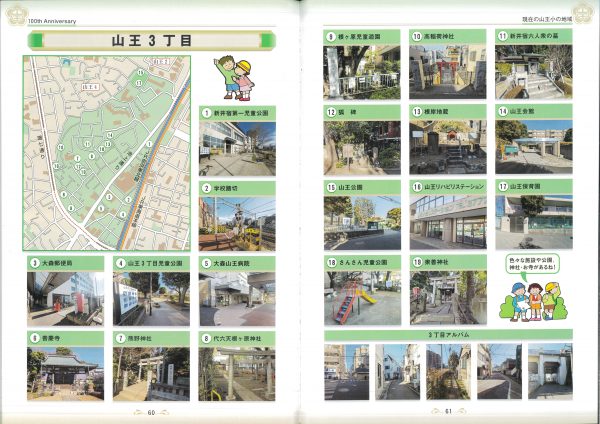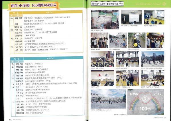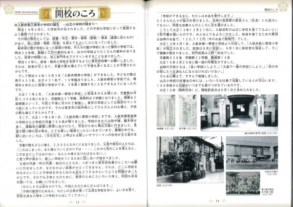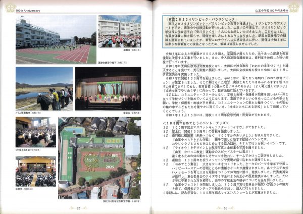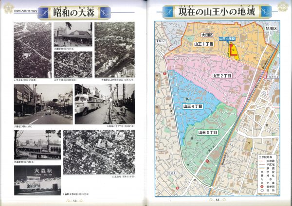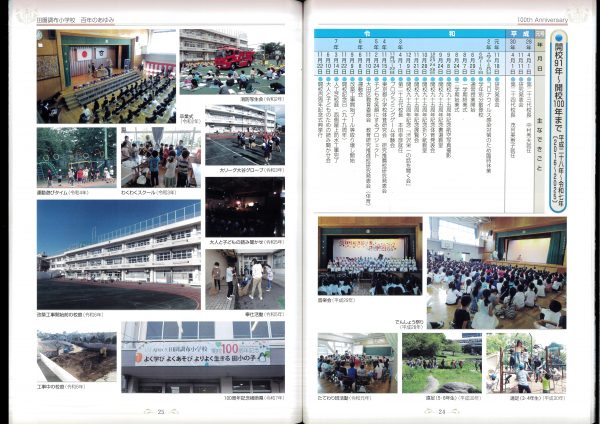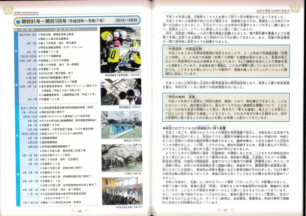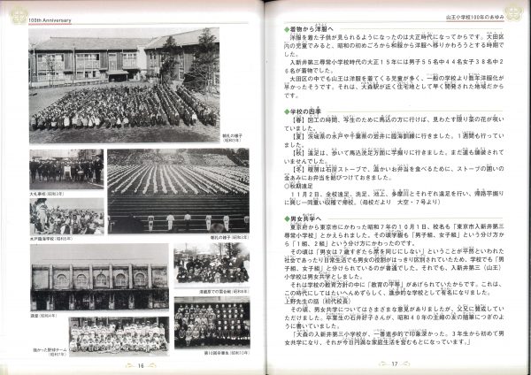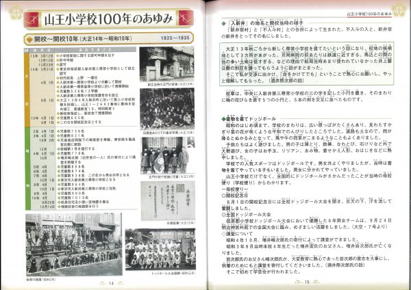 今年度100周年記念誌の紹介です 表紙とあゆみを中心にお届けします 2冊セットです、右側は児童のコメント(集合写真なし)入りです 山王の歴史ものがたりの内容です↓ 年表+写真;エピソードで4ページ10年で編集しました