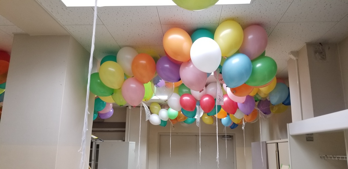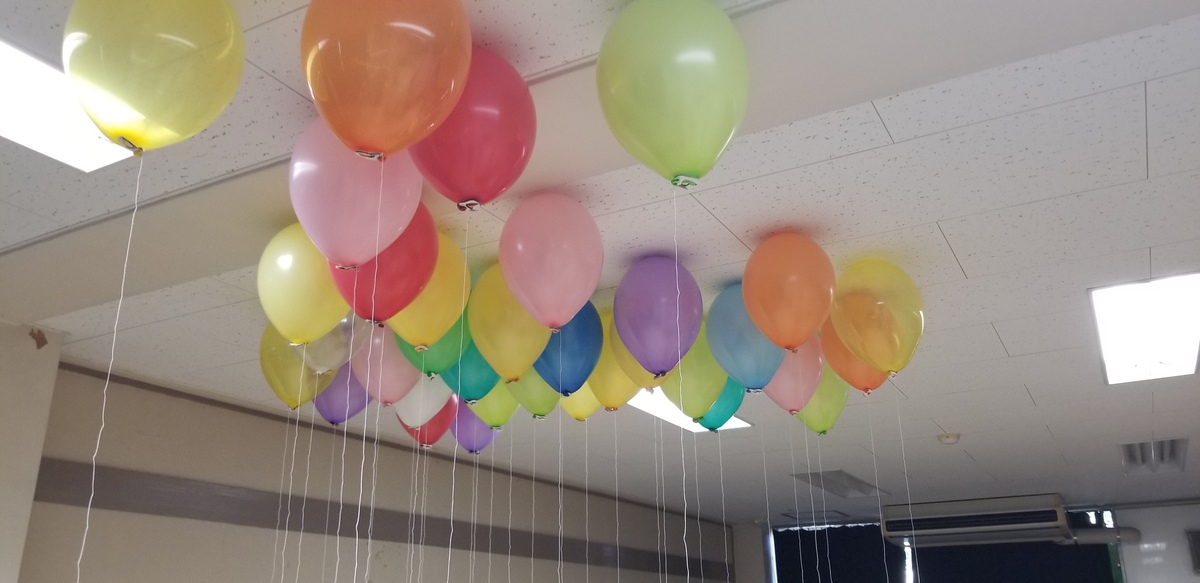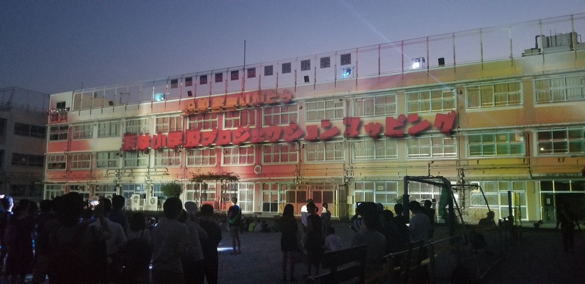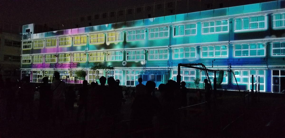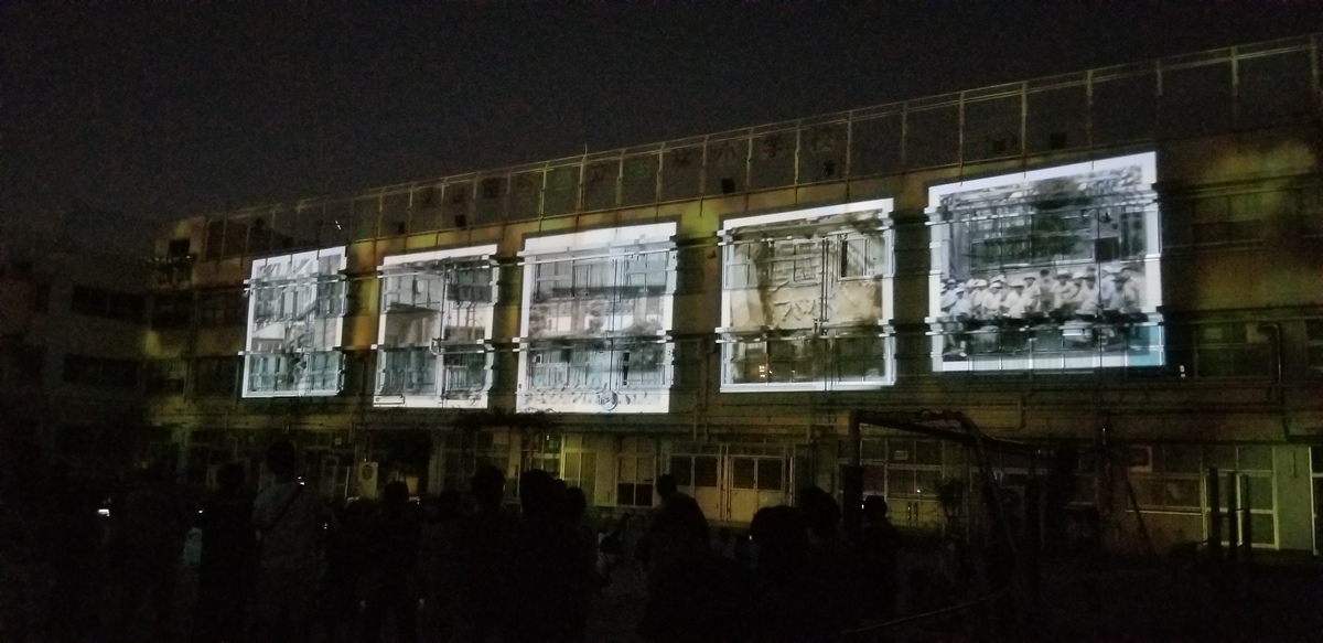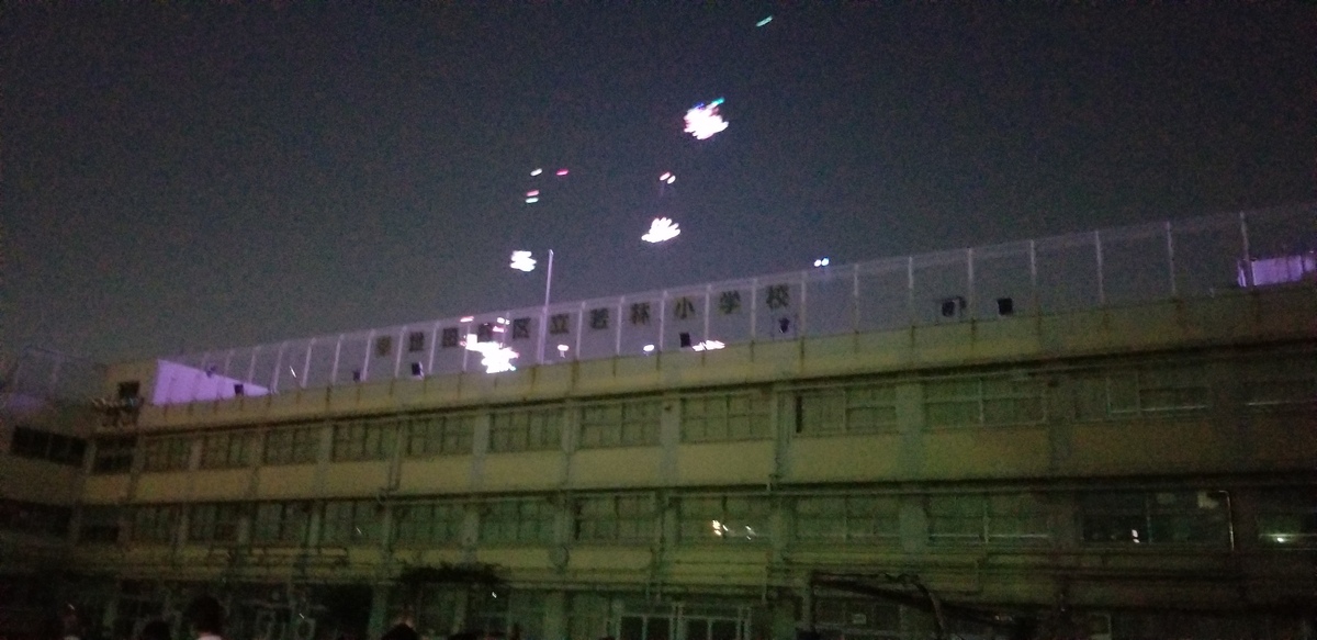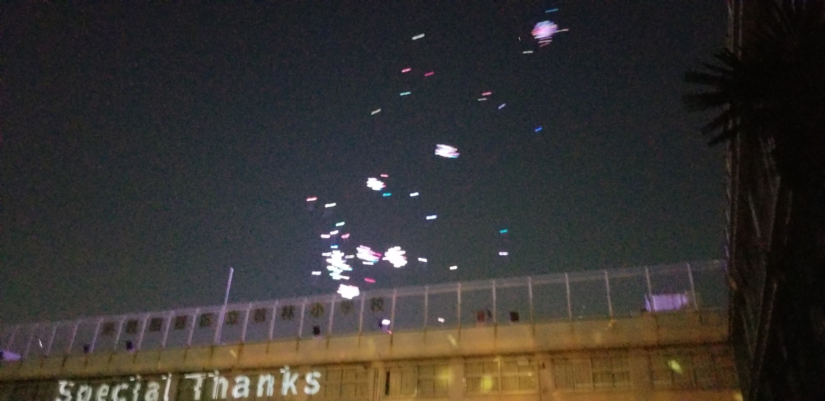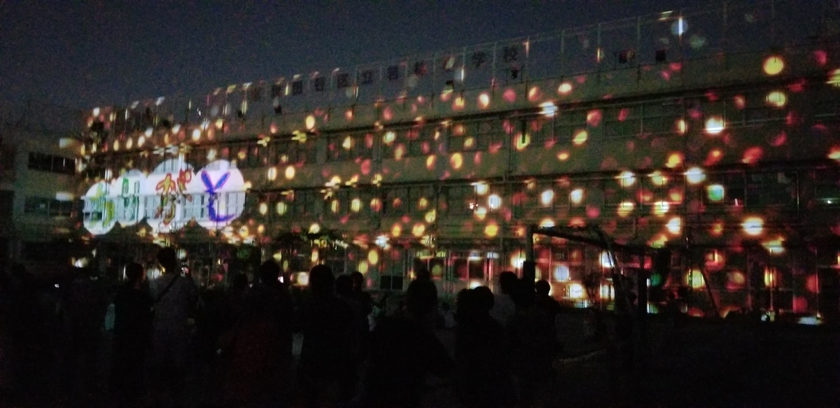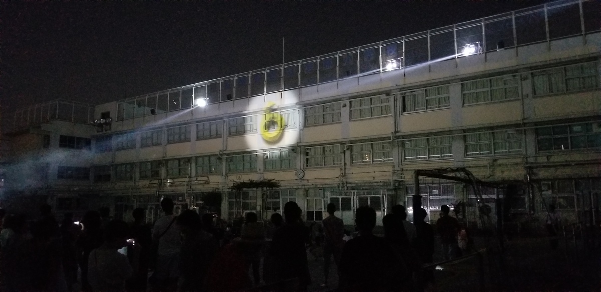 8/10(土)都内の小学校で51年経った校舎の取り壊しが決まり、そのためにお別れイベントとしてプロジェクションマッピングと題して、校舎の壁面を使って様々な映像を写すイベントで多数の来場者があり、異例の入れ替え制となりました。 風船は1束20個x21個用意しました。校舎側では準備万端、まさに始まろうとしています。カウントダウンが始まり、このように最後は光に照らされた風船は夜空を飛んでいきました。