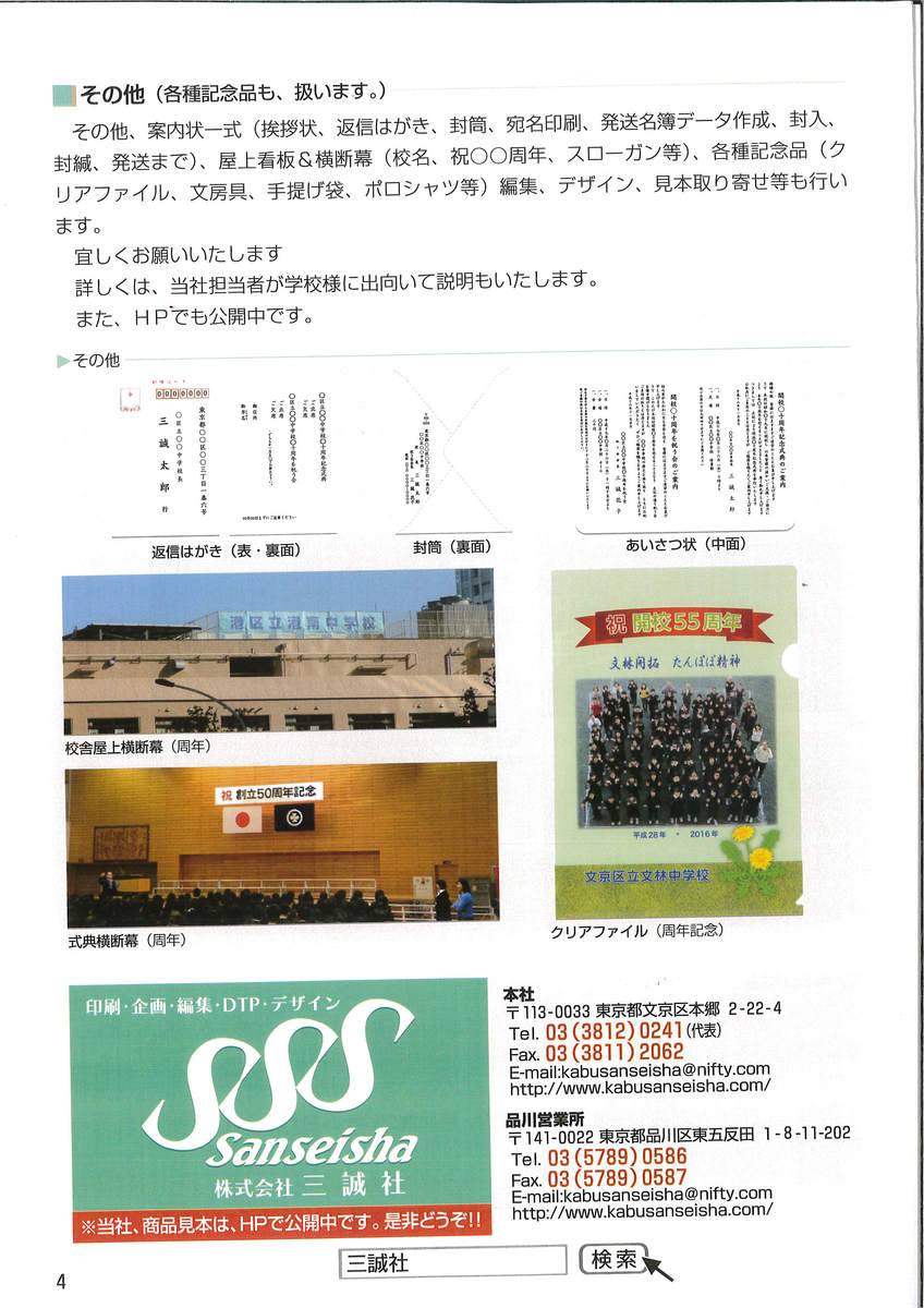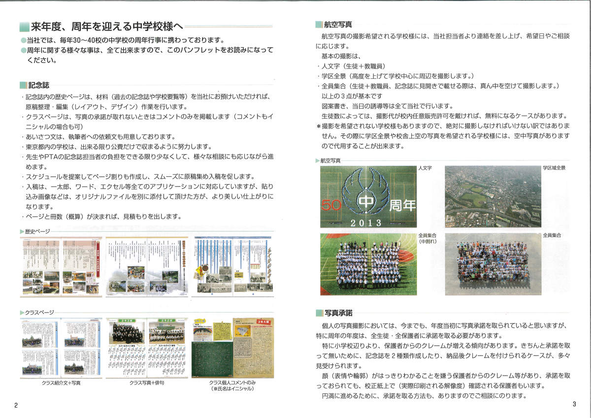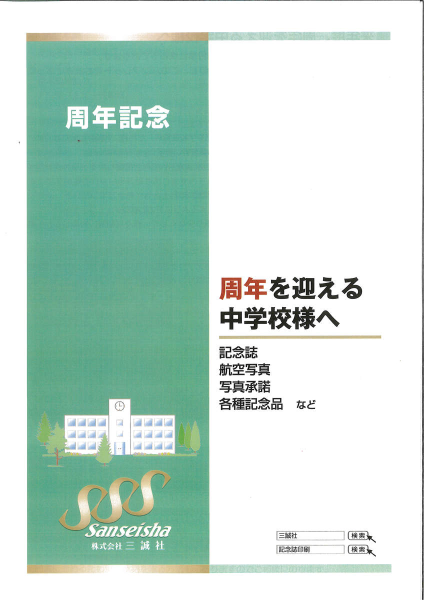 考えられるものは、一番は記念誌です、特に中学校先生方は忙しくこの作成が大変です、当社では全てのページの材料をいただいて原稿整理して、編集、校正をいたします、そのことで先生の負担を軽くします。特に歴史部分は、過去の記念誌をお借りして、年表の文字打ち、写真スキャンして補正、そしてレイアウトもいたしますので、その他のページ全てレイアウトなしでも問題ありません。