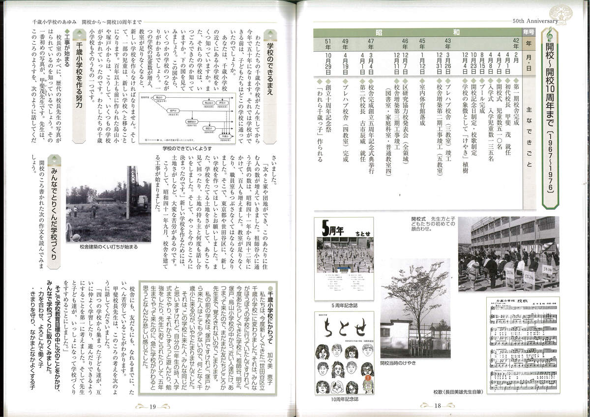 このように記念誌と副読本が合体した形で見開きに作ると年表と物語を一度に比較しながら右左と確認しながら読むことが出来ます。この左側の内容は過去の記念誌や副読本から引用していますが、最近10年の文章は先生にお願いしました。このように編集するとわざわざ分冊にしないで1冊にまとめることもできます。