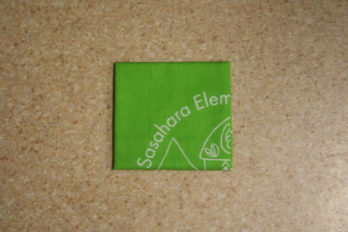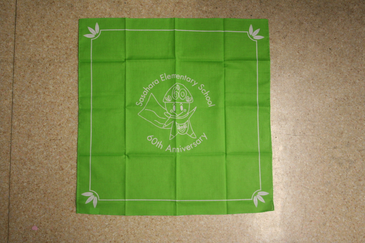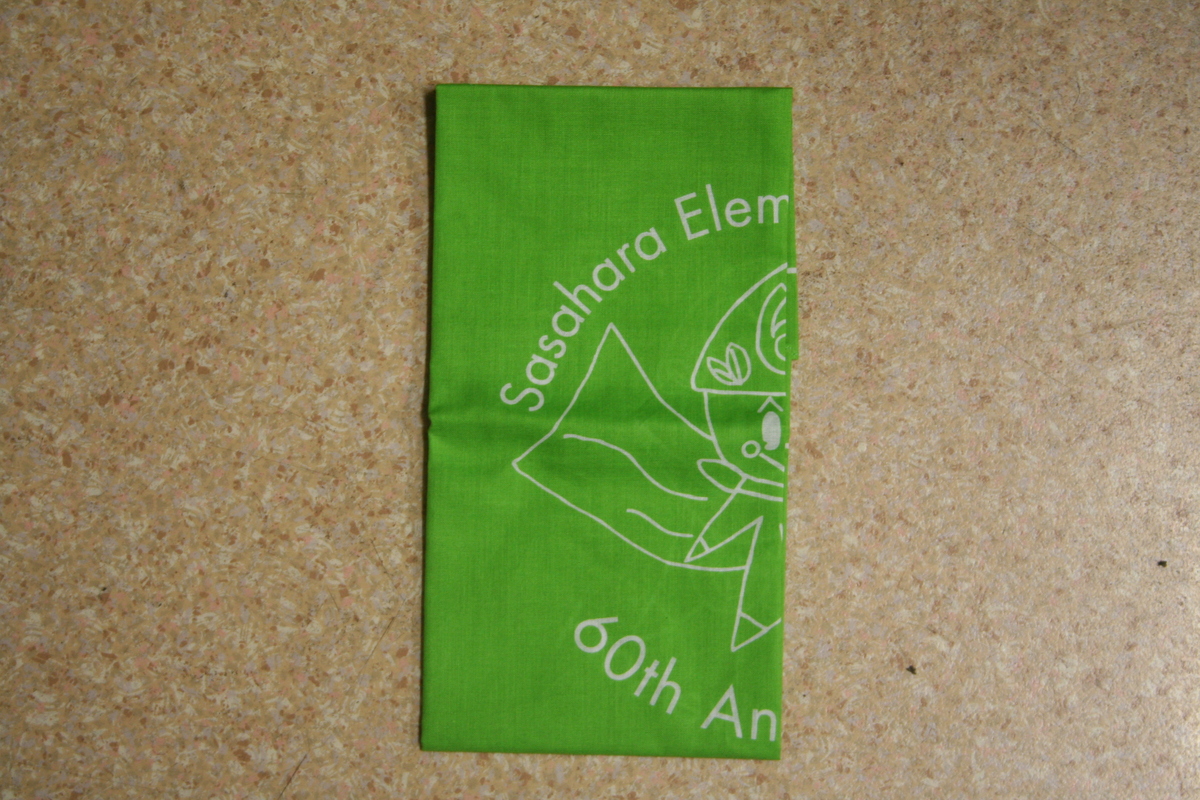 周年を迎える学校様より、春の校外学習のためにバンダナをつくりたいとの依頼を受けて作成しました。 原画をもらってへ編集してから印刷しました。 元の絵です→、それを元に1色で編集してバンダナの生地に印刷すると→→→このように周囲に笹の葉のイラストを入れると中央のキャラクターが引き立ちます。元は白い生地から絵柄以外を緑色に染めるとこのようになりました。児童や保護者からも好評でした。