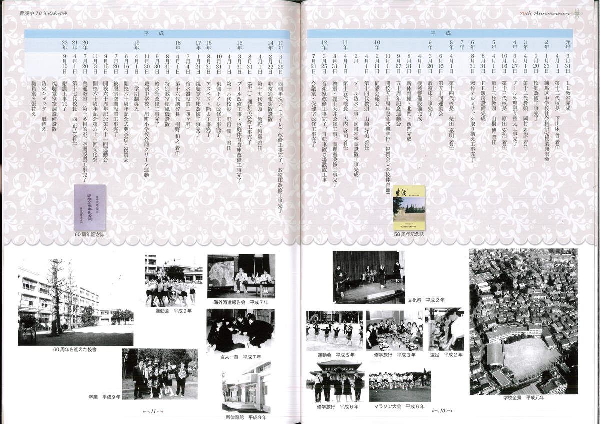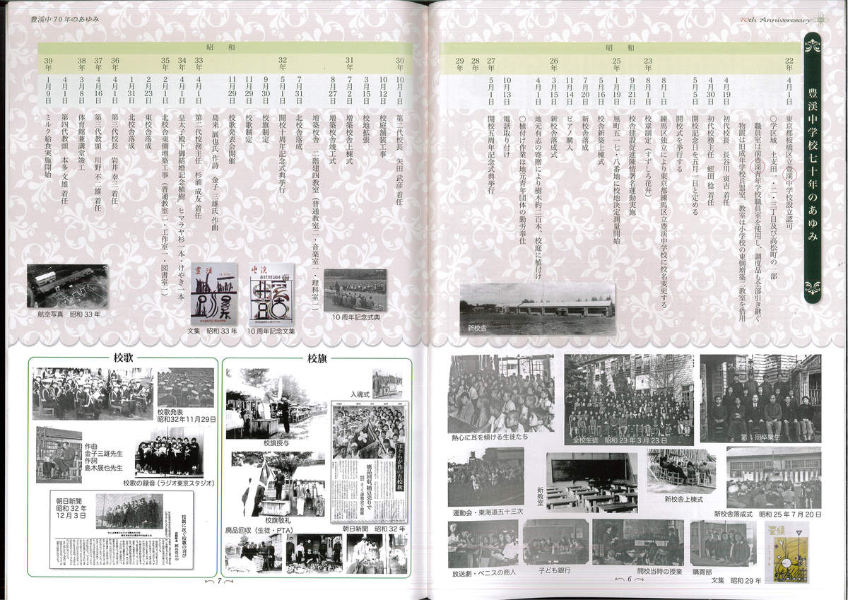 歴史の頁です、年表を3分の2、残りのスペースに過去の記念誌からの写真をスキャンして載せました。